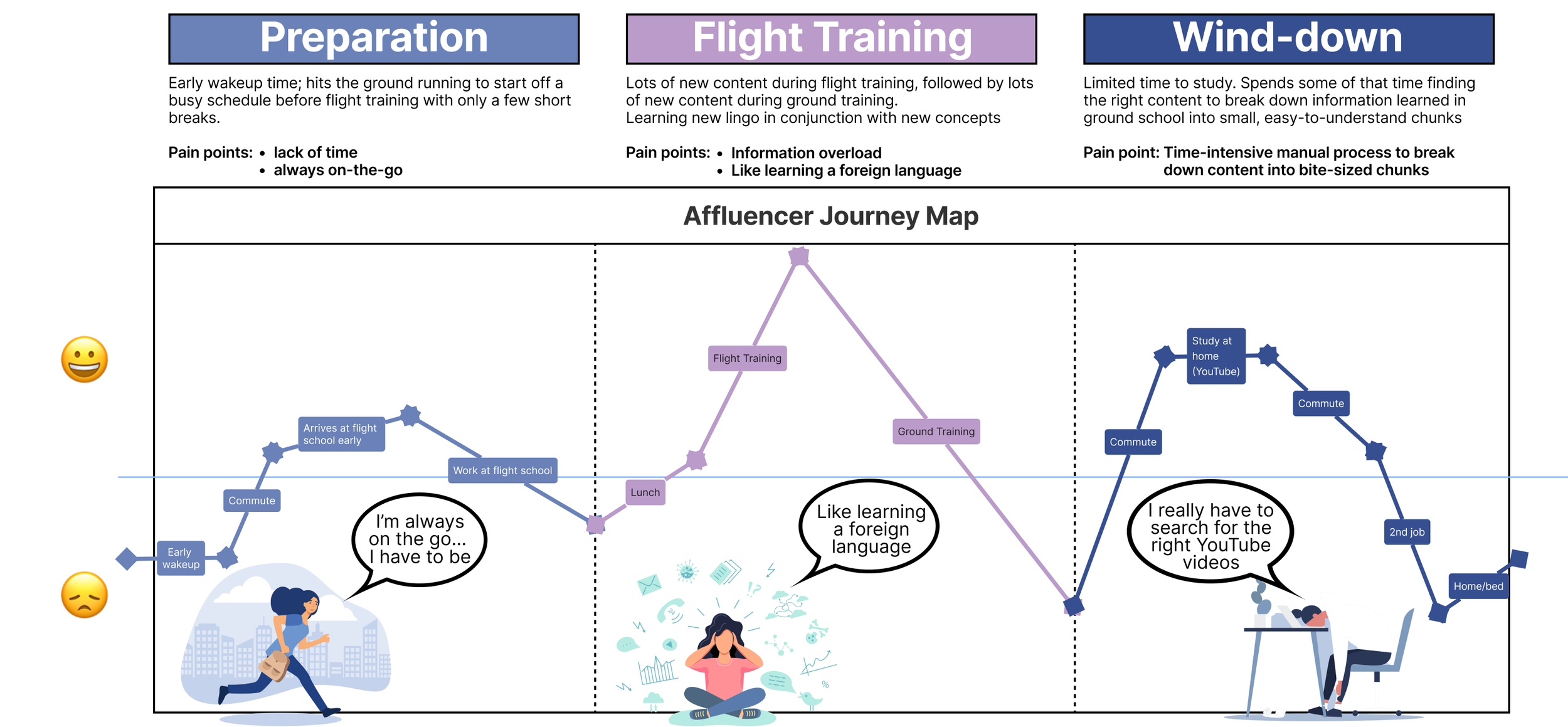 Existing resources target the end of the user journey for student pilots, focusing on helping them pass the written exam. However, students are often overwhelmed with new, information early on in flight school.